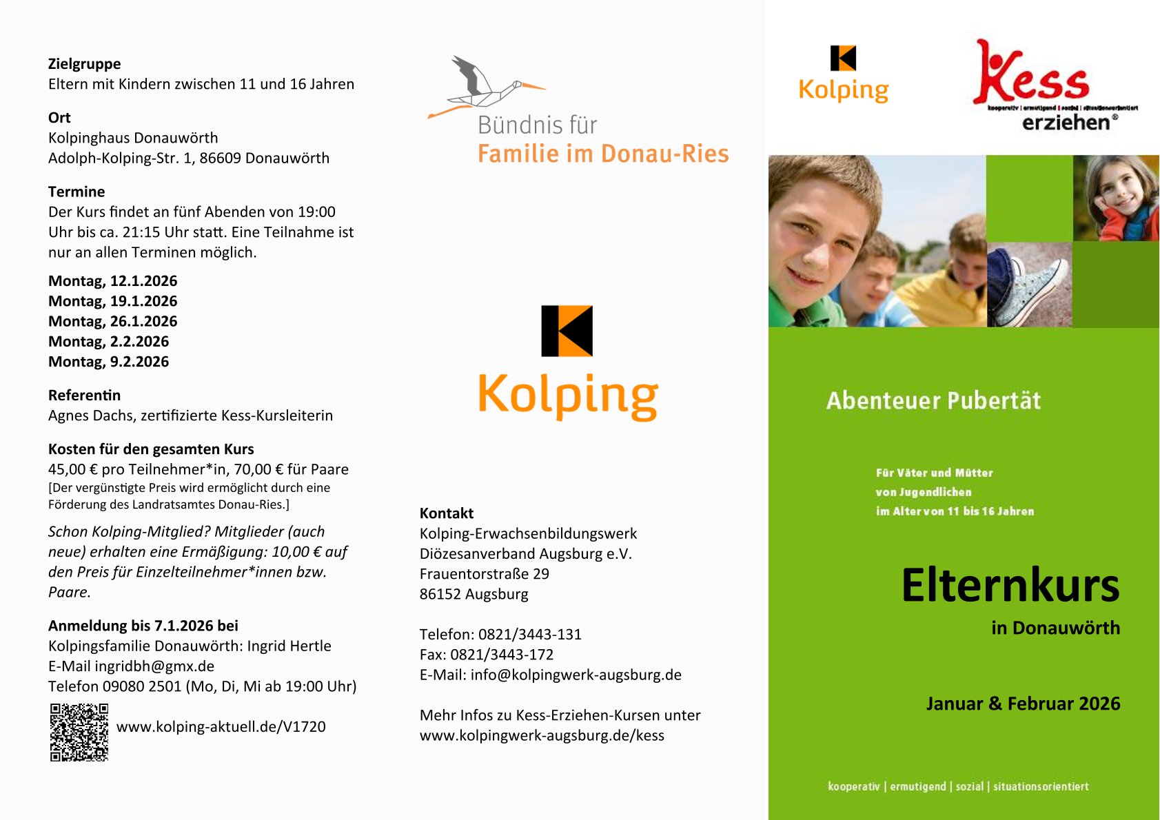 Der praxisorientierte Elternkurs findet an insgesamt fünf aufeinanderfolgenden Abenden ab 12. Januar 2026 (immer montags) von jeweils 19:00 Uhr bis ca. 21:15 Uhr im Kolpinghaus Donauwörth statt.