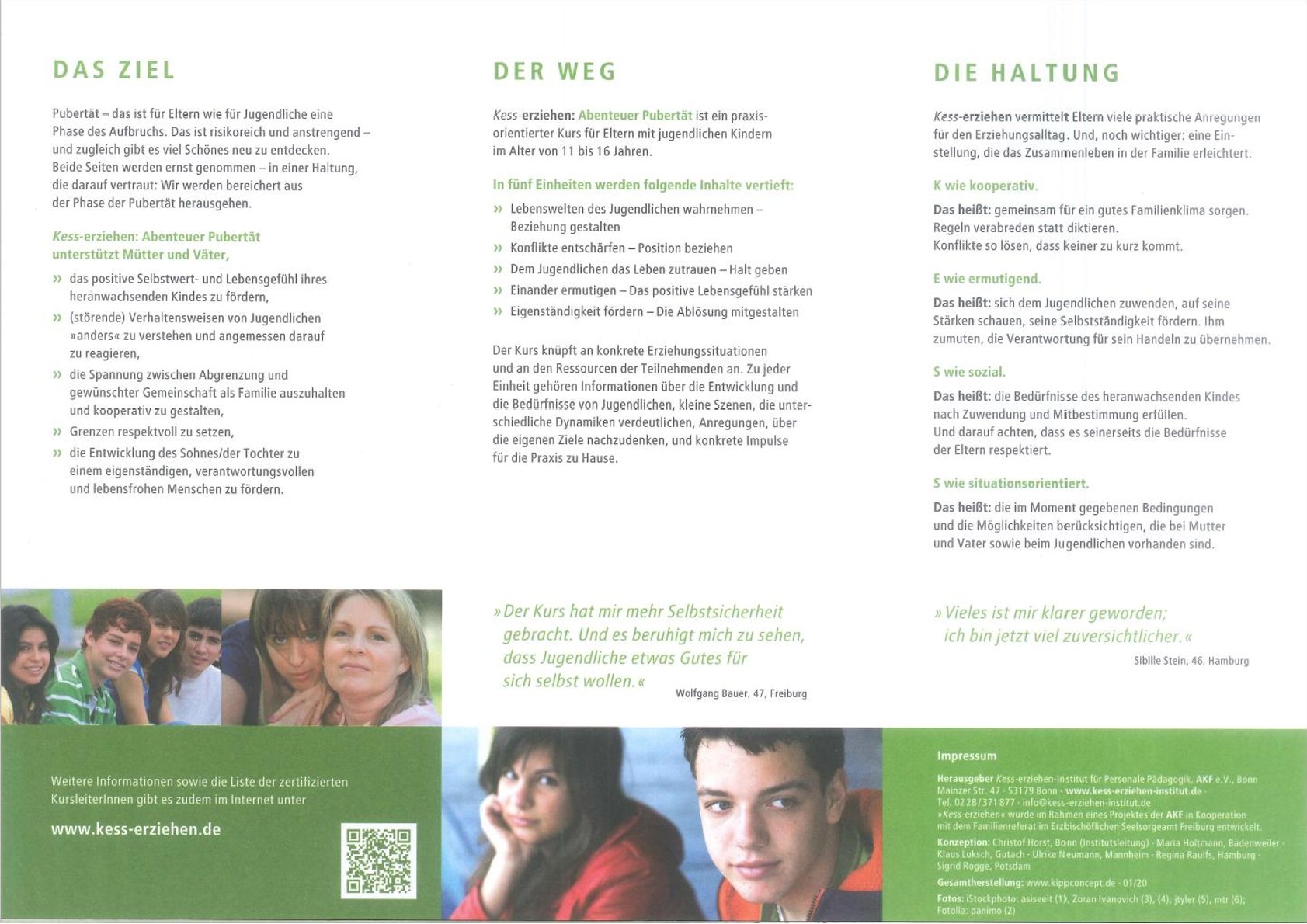 Im Mittelpunkt steht die gemeinsame Erkenntnis: Pubertät ist eine wichtige Aufbruchsphase – für Jugendliche und für Eltern. Sie birgt Risiken und Kraftproben, eröffnet aber auch viele neue Chancen und schöne Momente. Der Kurs nimmt beide Seiten ernst und vermittelt eine Haltung des Vertrauens: Familien können gestärkt und bereichert aus dieser Zeit hervorgehen.
